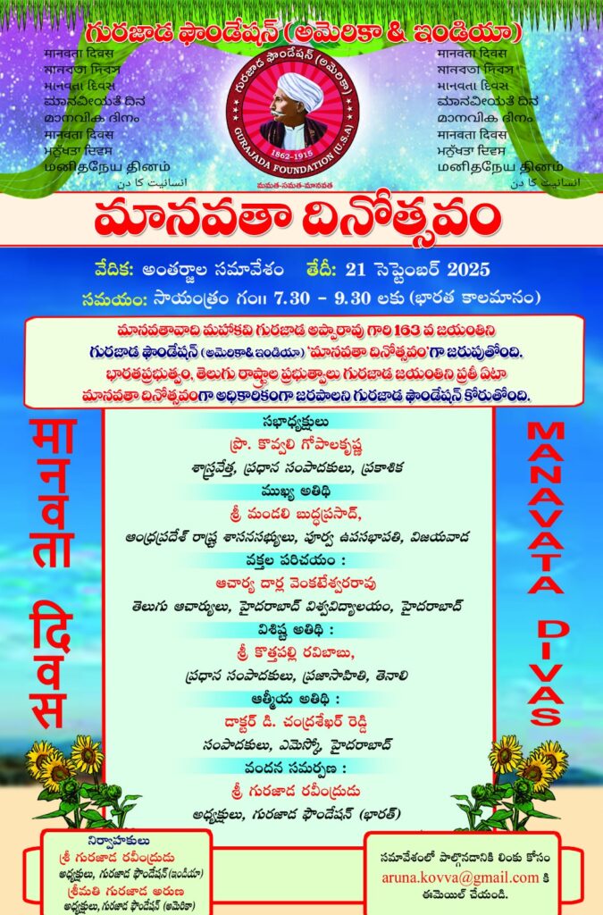 Sign in Welcome! Log into your account your username your password Forgot your password? Get help Create an account Create an account Welcome! Register for an account your email your username A password will be e-mailed to you. Password recovery Recover your password your email A password will be e-mailed to you. Homeతాజా ప్రచురణలుప్రకాశిక కార్యక్రమాలు మానవతా దినోత్సవం – 21 సెప్టెంబరు 2025 By Prakasika September 13, 2025 0 297 FacebookTwitterPinterestWhatsApp 5/5 - (1 vote) Author: Prakasika Tags21 సెప్టెంబరుManavata Divasఆచార్య కొవ్వలి గోపాలకృష్ణకొత్తపల్లి రవి బాబుగురజాడ రవీంద్రుడుడా డి చంద్రశేఖర్ రెడ్డిదార్ల వేంకటేశ్వర రావుప్రకాశికమండలి బుద్ధ ప్రసాద్మానవతా దినోత్సవం Share FacebookTwitterPinterestWhatsApp Previous articleఅవలోకనం అవశ్యంNext articleగురజాడ మార్గం ఏది? ఆయన వారసులెవరు? Prakasika Related Articles Jan - Mar 2026 సంపుటి 1 సంచిక 6 ~ జనవరి – మార్చి 2026 Oct - Dec 2025 సంపుటి 5 సంచిక 4 ~ అక్టోబర్ – డిసెంబర్ 2025 Home నీలగిరి పాటలు Latest Articles Jan - Mar 2026 సంపుటి 1 సంచిక 6 ~ జనవరి – మార్చి 2026 Oct - Dec 2025 సంపుటి 5 సంచిక 4 ~ అక్టోబర్ – డిసెంబర్ 2025 Home నీలగిరి పాటలు తాజా ప్రచురణలు గురజాడ మార్గం ఏది? ఆయన వారసులెవరు? Jul - Sep 2025 అవలోకనం అవశ్యం Load more